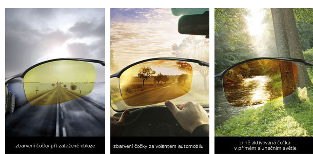 - reagují na různé světelné podmínky – od zatažené oblohy až po jasný sluneční svit – využívají viditelné spektrum světla i UV záření a díky této vlastnosti se jako jediné dokážou zabarvit i za sklem automobilu